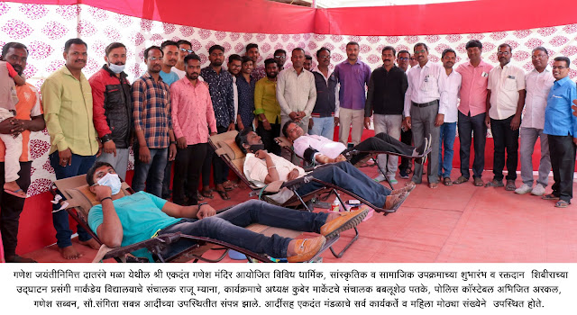 सालाबादप्रमाणे गणेश जयंतीनिमित्त एकदंत गणेश मंडळाच्यावतीने विविध धार्मिक, सांस्कृतिक तसेच सामाजिक उपक्रमांचे आयोजन करण्यात आले असून त्या सर्व कार्यक्रमाचा शुभारंभ व रक्तदान शिबीराचे उद्घाटन मार्कंडेय विद्यालयाचे संचालक राजू म्याना, कार्यक्रमाचे अध्यक्ष कुबेर मार्केटचे संचालक बबलू पतके, पो. कॉ. अभिजित अरकल, गणेश सब्बन, सौ.संगिता सबन्न आदींच्या उपस्थितीत संपन्न झाले. यावेळी रक्तदान शिबीरात श्री एकदंत गणेश मंडळाच्या 122 युवकांनी उत्सर्फुतपणे रक्तदान केले. या रक्तदान शिबीरात दातरंगे मळा परिसरातील नागरीकांसह नगर शहरातील युवकांनी सहभाग घेतला.